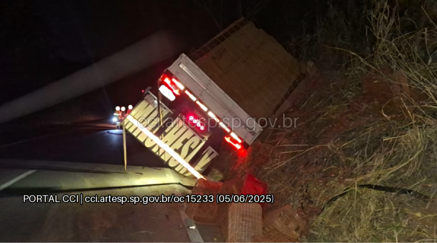 Uma carreta Mercedes-Benz Atron tombou na noite de quarta-feira (04/06), por volta das 21h22, na Rodovia SP-79, altura do km 104,300, no município de Votorantim (SP). O veículo seguia pela faixa adicional da pista quando, por motivos ainda a serem esclarecidos, o condutor perdeu o controle da direção. A carreta saiu da pista, adentrou o canteiro lateral e tombou em um talude.